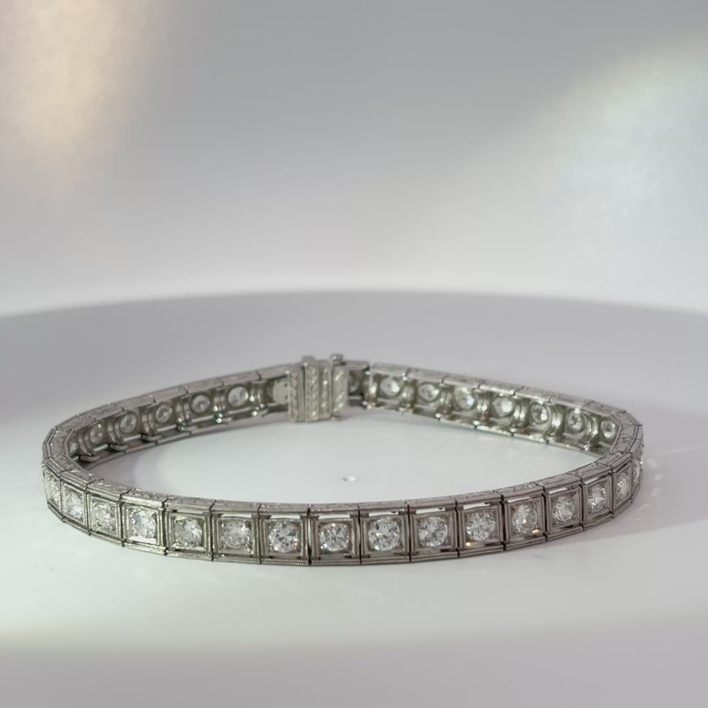 Sublime bracelet tennis en platine, orné d'une myriade de diamants ronds taille brillant. Ciselé à la main, il scintille avec un éclat exceptionnel, mettant en lumière le travail d'un artiste attentionné. Un bijou intemporel, synonyme d'élégance et de raffinement, parfait pour rehausser votre allure en toute occasion.