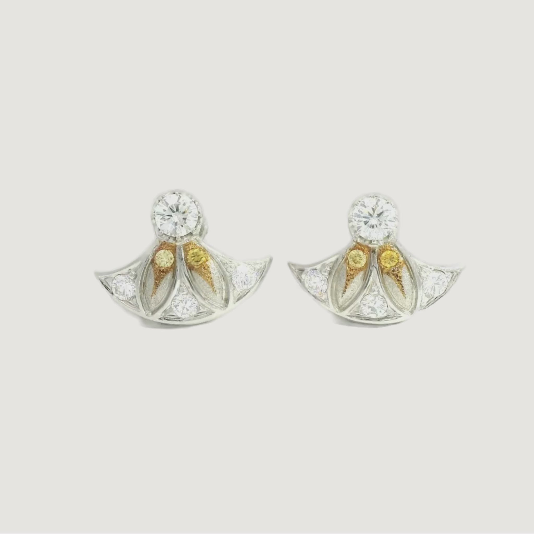 Sublimes Boucles d'oreilles en platine, rehaussés d'or jaune 18K, présentant un diamant et deux magnifique diamant jaune de taille brillant. Ces bijoux délicats captent la lumière avec élégance, ajoutant une touche de sophistication discrète à toute tenue. Un choix parfait pour celles qui apprécient le luxe raffiné et intemporel.