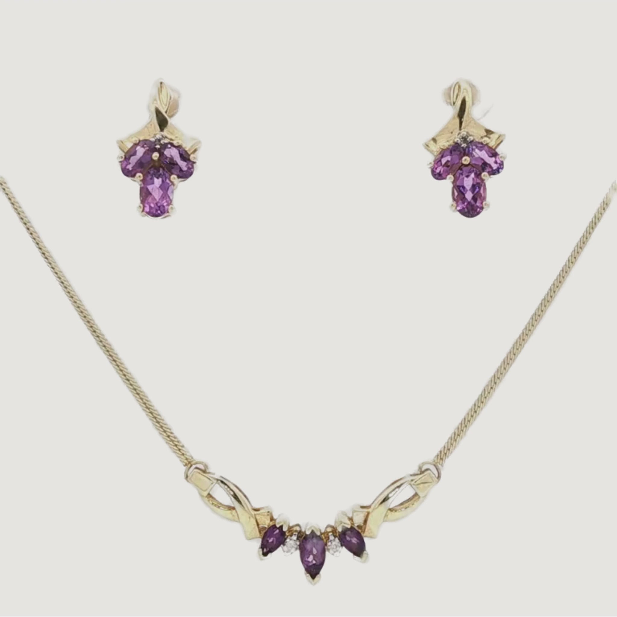Sublime collier en or jaune agrémenté d'améthystes et diamants, ainsi qu'une paire délicate de boucles d'oreilles. La chaîne délicate met en valeur le pendentif au design raffiné. Cette parure de bijou est idéal pour rehausser une tenue avec une touche de couleur subtile et élégante.
